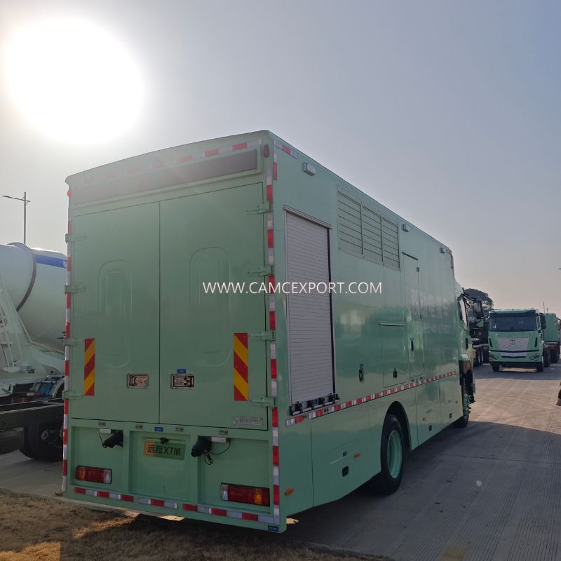 It adopts a 4×2 left-hand drive configuration, with a methanol engine as the core power and a continuous output power of 320KW; it is equipped with a large-capacity methanol fuel tank, which can run continuously for more than 12 hours under full-load power supply; the flat-roof design makes the overall vehicle height adapt to various height-restricted sections, with a protection grade of IP54, which can meet the outdoor operation needs of rain and dust protection; the curb weight complies with the relevant standards for heavy-duty special operation vehicles, ensuring compliance in both driving and operation.